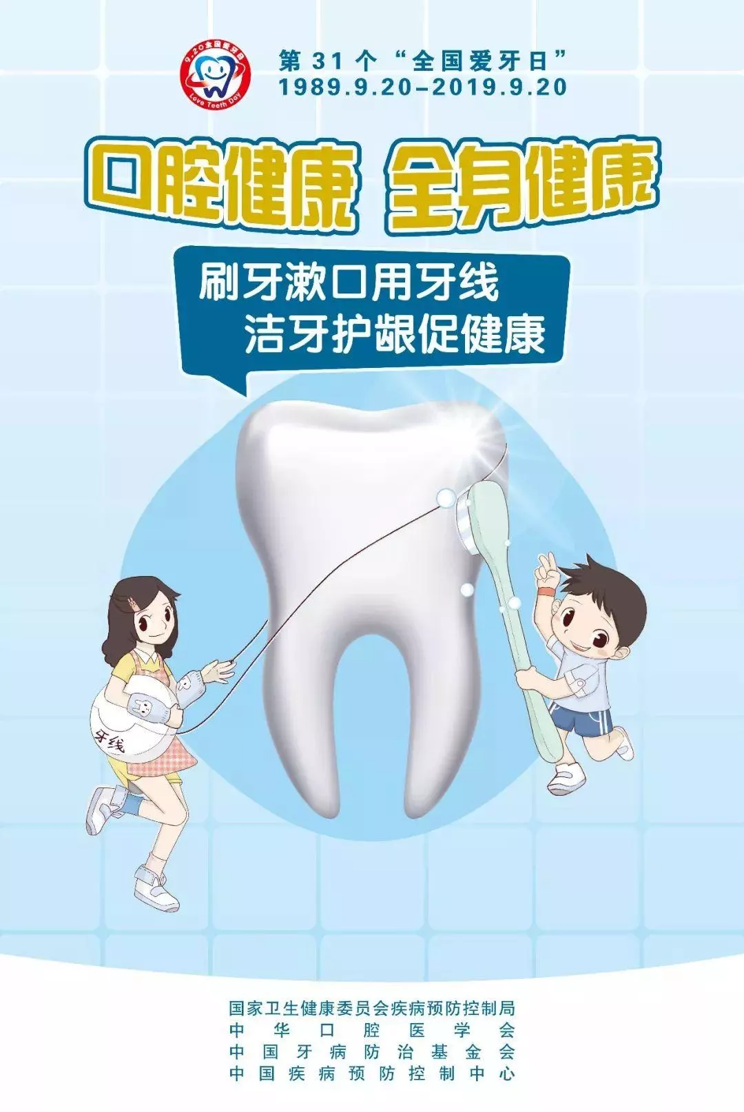 2019年9月20日是第31个全国“爱牙日”,今年“爱牙日”的宣传主题是“口腔健康全身健康”,副主题是“刷牙漱口用牙线 洁牙护龈促健康”。