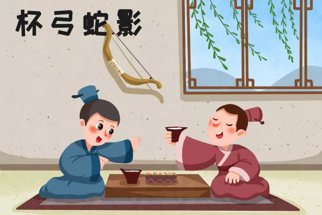 晋代的乐广有一位好友,好久没来做客。终于有一天再来,乐广问他为什么这么长时间没来,好友说:“上次在你这喝酒,忽然看见杯中有一条蛇,碍于情面,还是硬着头皮把酒喝下去,但从那之后,总觉得有蛇在腹中蠕动,整天忧心忡忡,恶心欲吐,最后竟病倒了。”乐广回忆上次宴请宾客的时候,家中墙壁上挂着一张弓,猜想好友所见杯中的蛇,应该就是弓的影子。于是请朋友还坐在上次的位置,倒了一杯酒,墙上弯弓的影子又映入杯中,宛如一条游动的小蛇,他惊得目瞪口呆,乐广把事情的原委告诉了他,朋友疑窦顿开,压在心上的石头被搬掉,病也随之而愈。