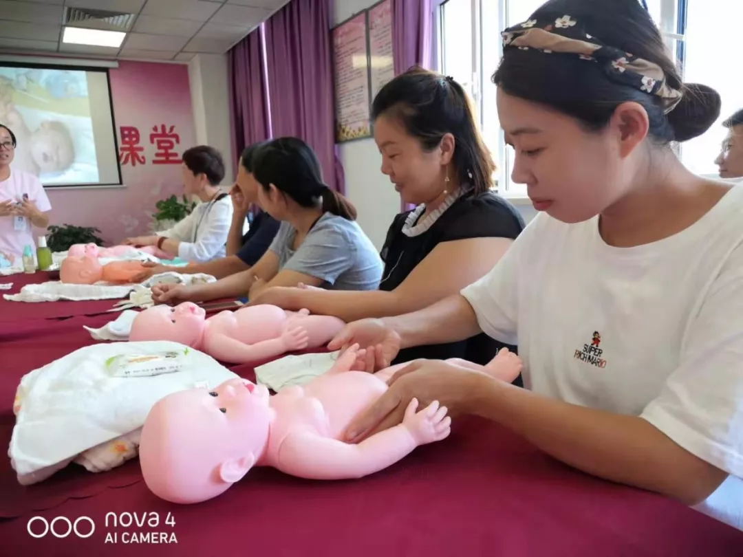 瞧,大家通过专心致志地给“宝宝”洗澡、抚触、戴尿不湿、穿脱宝宝服、做新生儿脐部护理等等,眉眼之间无不向未来宝宝传递着一份份浓浓的爱意,幸福和美从这一刻开始向心灵深处蔓延……