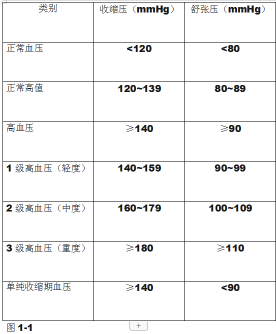 临床上高血压可分为原发性高血压和继发性高血压两类,其中原发性高血压占所有高血压患者的90%以上。一个健康成年人的高血压应控制在120/80mmHg左右,目前国内高血压诊断采用2005年高血压治疗指南建议的标准,如图1-1
