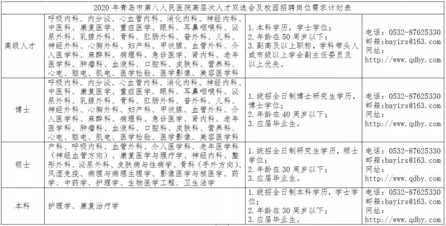 附件:2020年青岛市第八人民医院高层次人才双选会及校园招聘岗位需求计划表