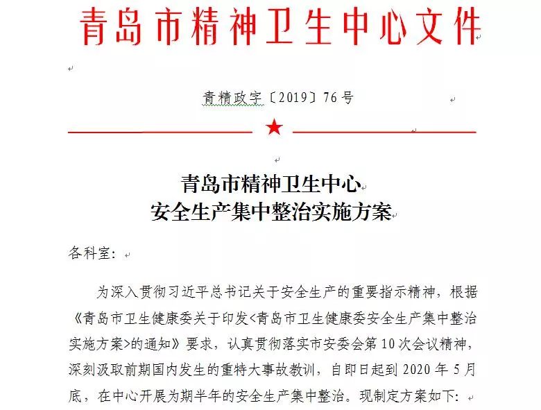 中心按照市卫生健康委安全生产集中整治行动要求,结合自身实际,制定印发了《青岛市精神卫生中心安全生产集中整治实施方案》,分动员部署、集中整治、分析研判总结提高三个阶段,组织开展为期5个月的安全生产集中整治行动。集中整治行动立足于防风险、治隐患,突出综合整治和消防、危险化学品等重点内容,着力解决政治站位不高、红线意识不强、安全责任缺位、隐患排查不扎实和预案管理、应急演练、安全生产培训三个不到位的问题等问题。对安全生产责任不落实、集中整治推动不力、整改落实走形式的,要依法依规依纪严肃追责问责。