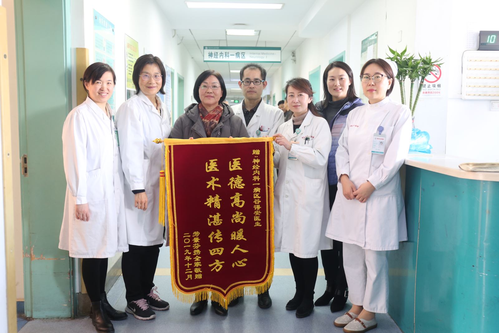2020年1月2日,新的一年上班第一天,劳阿姨在女儿何女士的陪同下来到青岛市中心医院神经内一科医师办公室,将一面印有“医德高尚暖人心 医术精湛传四方”烫金大字的锦旗送到谷得安医生的手中,感谢谷医生为自己救命又救急。