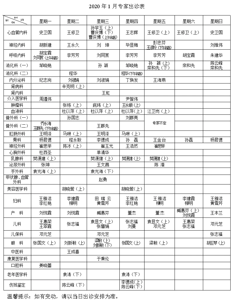 【温馨提示】青岛市第八人民医院2020年1月份专家出诊表