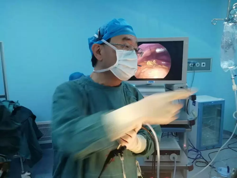 刘京山教授在我院进行一例高难度保胆手术,图为取出胆囊管内结石