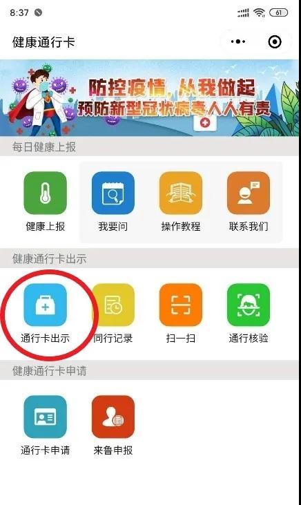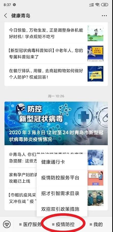 关注“健康青岛”微信服务号,点击下方菜单中的“疫情防控”-“健康通行卡”。