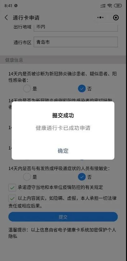 青岛市民可通过微信“健康青岛”进行网上申请,也可通过“爱山东”APP、微信“健康山东服务号”、支付宝“山东电子健康通行码”等途径进行网上申请,经与全省防疫数据库比对核验后自动生成电子健康通行码。
