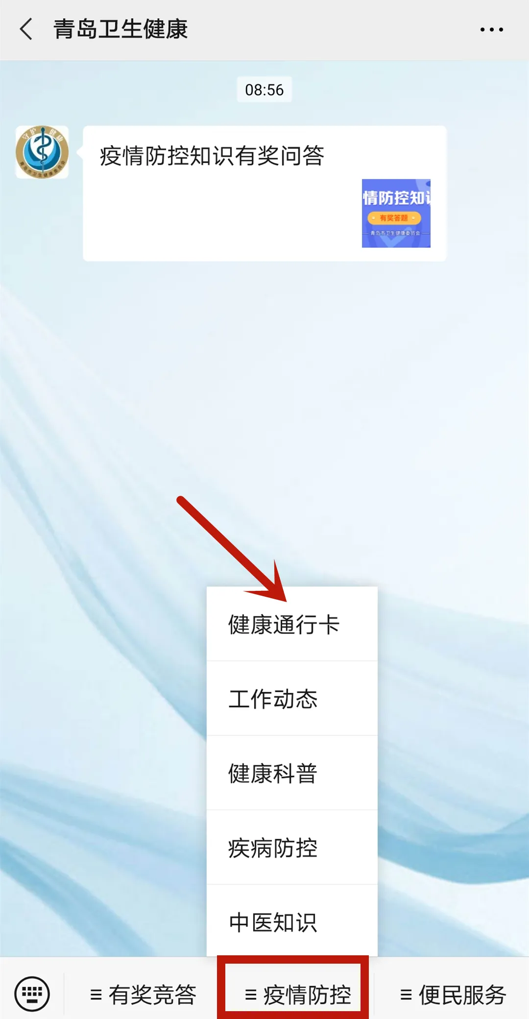 1.点击“青岛卫生健康”公众号下方菜单中的“疫情防控”中的“健康通行卡”;