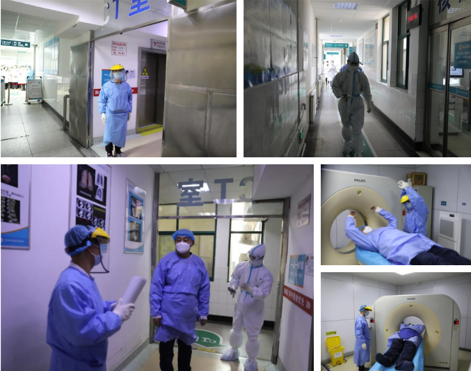 做好准备工作后,特殊发热门诊预检分诊护士引导患者至CT室检查并返回特殊发热门诊。影像科人员(二级防护)给予患者胸部CT检查,并于患者离开后对CT室实施终末消毒;保洁人员完成CT室外走廊等封锁通道公共区域消杀;预检分诊护士引导患者返回特殊发热门诊,并将患者收治2楼感染科单间隔离病房。