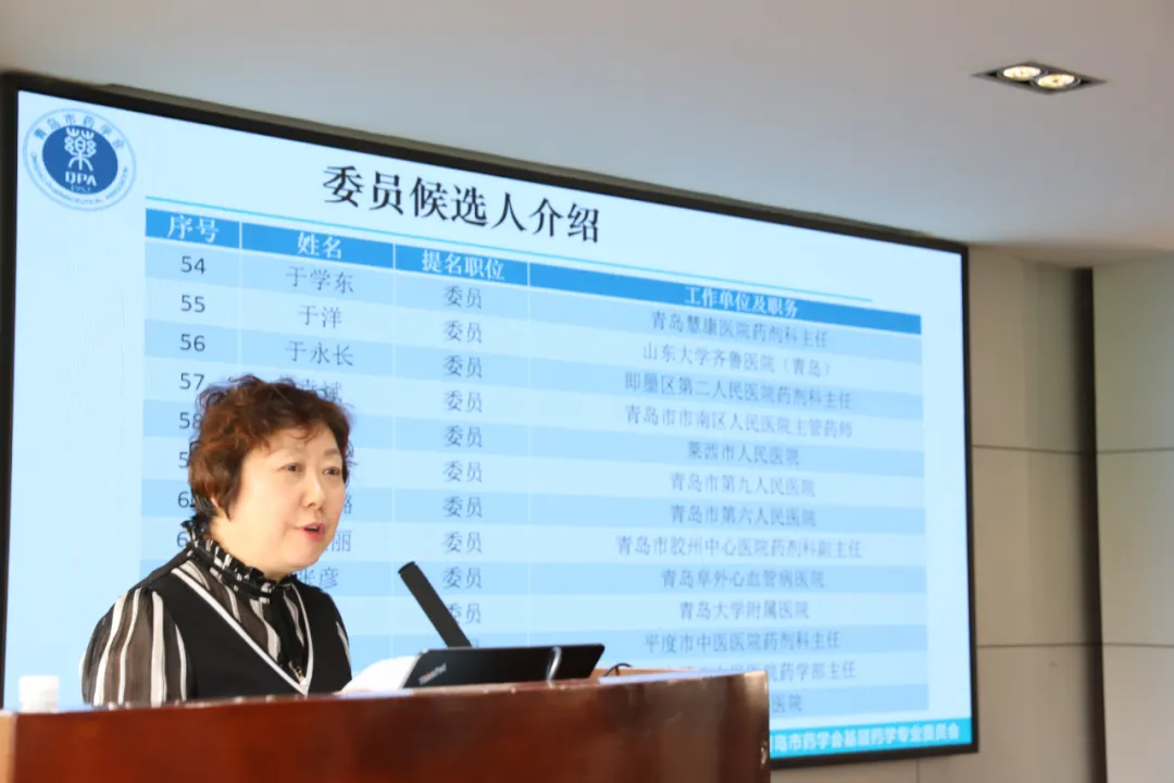 梁丽萍副秘书长介绍了本次大会的目的、意义,随后拟任主委和副主委共11位各单位的药剂科主任一一进行了自我介绍。梁丽萍副秘书长公布监票人和计票人。会议通过选举,选出杨晓秋同志为青岛市药学会基层药学专业委员会第一届主任委员,韩乃巍、姜山、姜燕飞、乔永洁、史永学、王爱平、王善良、薛卫强、于兆海、张淑英10位同志为副主任委员,于学东等同志当选专委会委员。