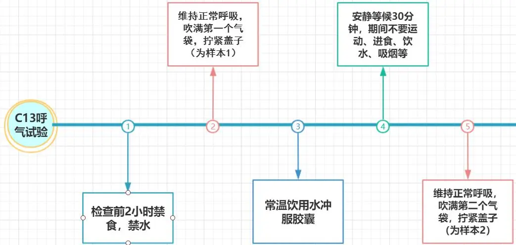 Hp进入胃内会分泌尿素酶,尿素酶可分解尿素产生氨气(NH3)和二氧化碳(CO2),CO2吸收进入血液,随血流进入肺部并以气体形式排出。受试者口服同位素(13C)标记的尿素胶囊后,如果胃内存在Hp,就可将13C标记的尿素分解为13C标记的CO2,收集受试者服药前后呼出的气体,检测受试者呼出的气体中有没有被标记的13C,就可以判断患者是否存在Hp感染。