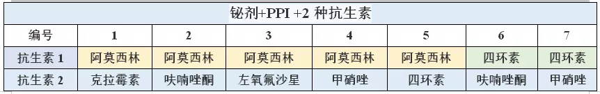 《我国第五次幽门螺杆菌感染处理共识(2017年)》推荐了7个含铋剂的四联方案(铋剂+PPI +2种抗生素),包含了阿莫西林、克拉霉素、甲硝唑、四环素、左氧氟沙星和呋喃唑酮6种抗生素。方案的选择主要是抗生素组合的选择,如下图所示: