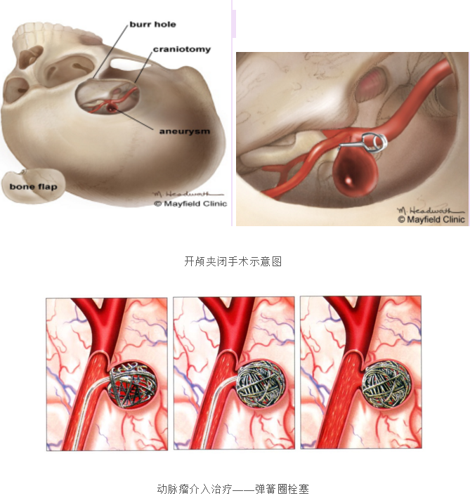 好了,言归正传,针对动脉瘤的手术治疗方式主要有两种,开颅夹闭手术和介入栓塞。