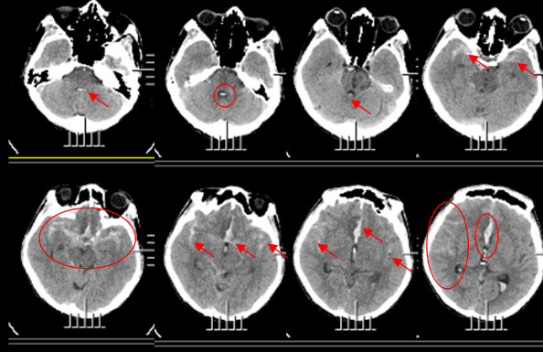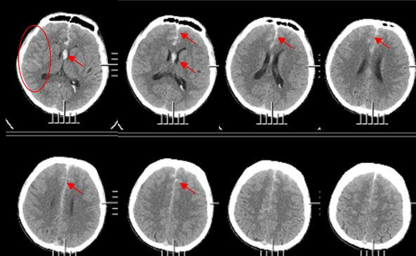 入院头颅CT显示双侧蛛网膜下腔、纵裂、基底池脑室广泛出血