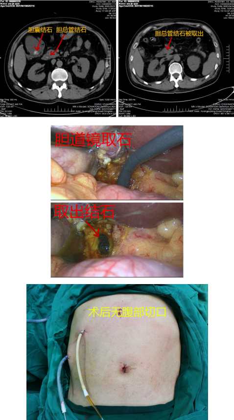 就是应用腹腔镜微创技术切除病变胆囊,在腹腔镜下切开胆总管,然后应用胆道镜放进胆总管,把胆总管内的结石取干净。术后腹部仅存两处0.5cm和两处1cm的小穿刺口。而且术后恢复快,疼痛轻,住院周期短,一般仅需要5到7天即可出院。