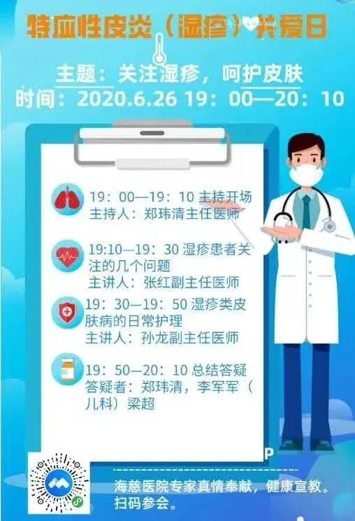 6月26日为“特应性皮炎关爱日”,主题为“关爱特应性皮炎,从娃娃抓起”。海慈医疗集团皮肤科、儿科专家参与线上活动将与您面对面,为您答疑解惑。