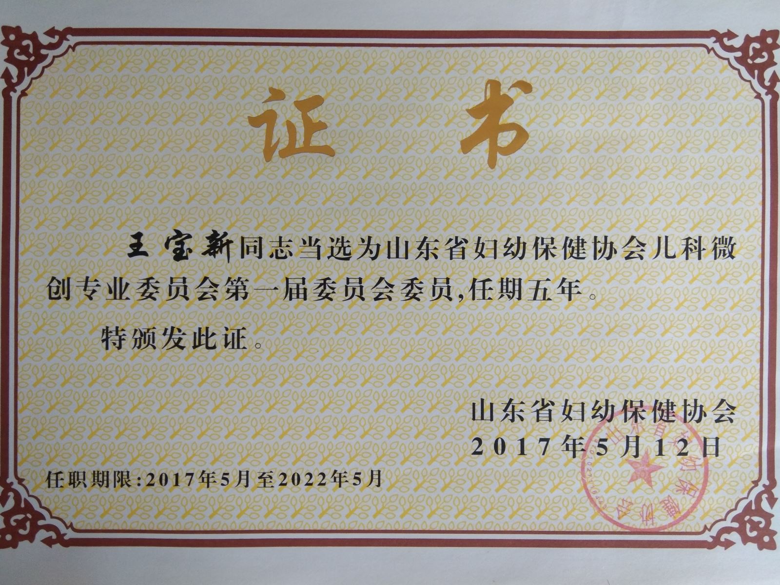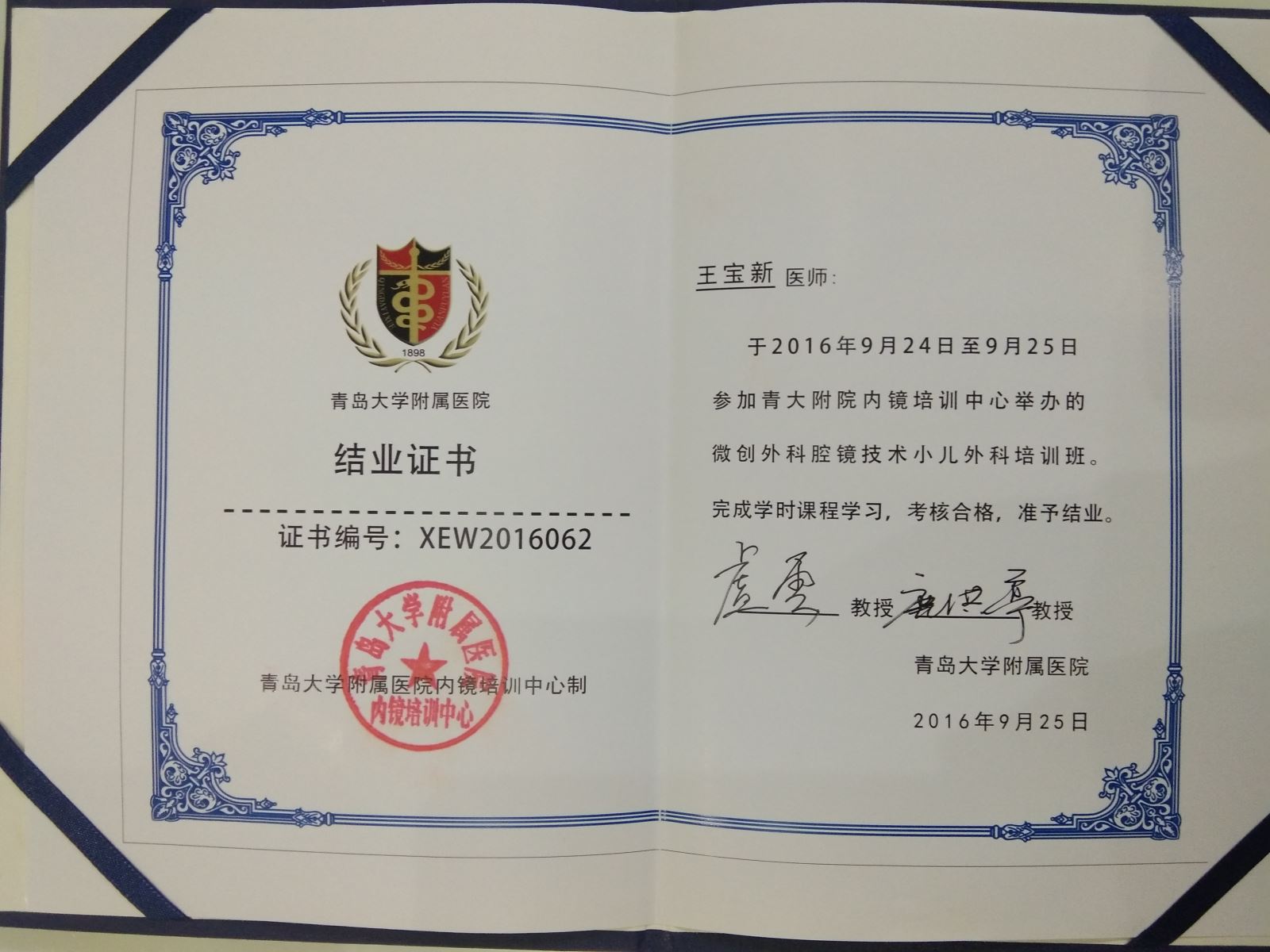 市人民医院小儿腹腔镜微创技术在医护人员的共同努力下,已经得到了长足的发展,学科带头人王宝新曾参加青岛大学附属医院举办的腹腔镜技术培训班,经过理论实践系统的培训,顺利结业.先后被评为青岛市及山东省医学会小儿外科分会委员,山东省妇幼保健协会儿科微创专业委员会委员,同时医院还拥有专业的小儿外科麻醉团队,曾在山东大学齐鲁医院小儿麻醉专业进修学习。