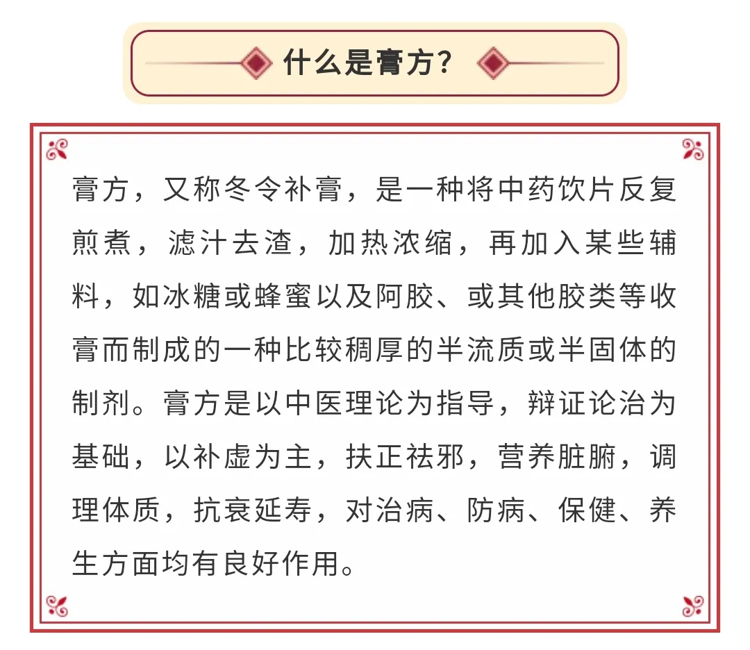 中医认为,膏方可调补人的精、气、神,增强体力,既可以治疗疾病,又能调理体质,是冬令进补的不二之选!