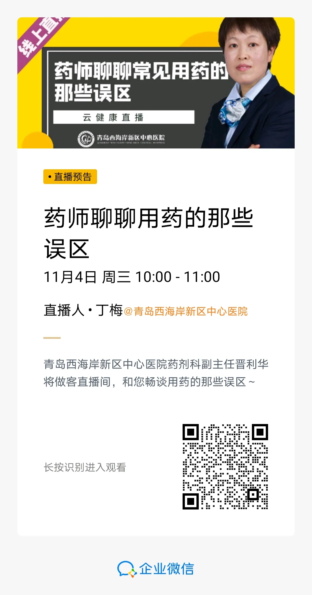 11月4日10:00,青岛西海岸新区中心医院将以“云科普”的形式发起直播,由青岛西海岸新区中心医院药剂科副主任晋利华带您了解如何避免常见的用药错误,并在现场为大家答疑解惑。如果您有想让医生回答的问题,可以在评论区留言哟~