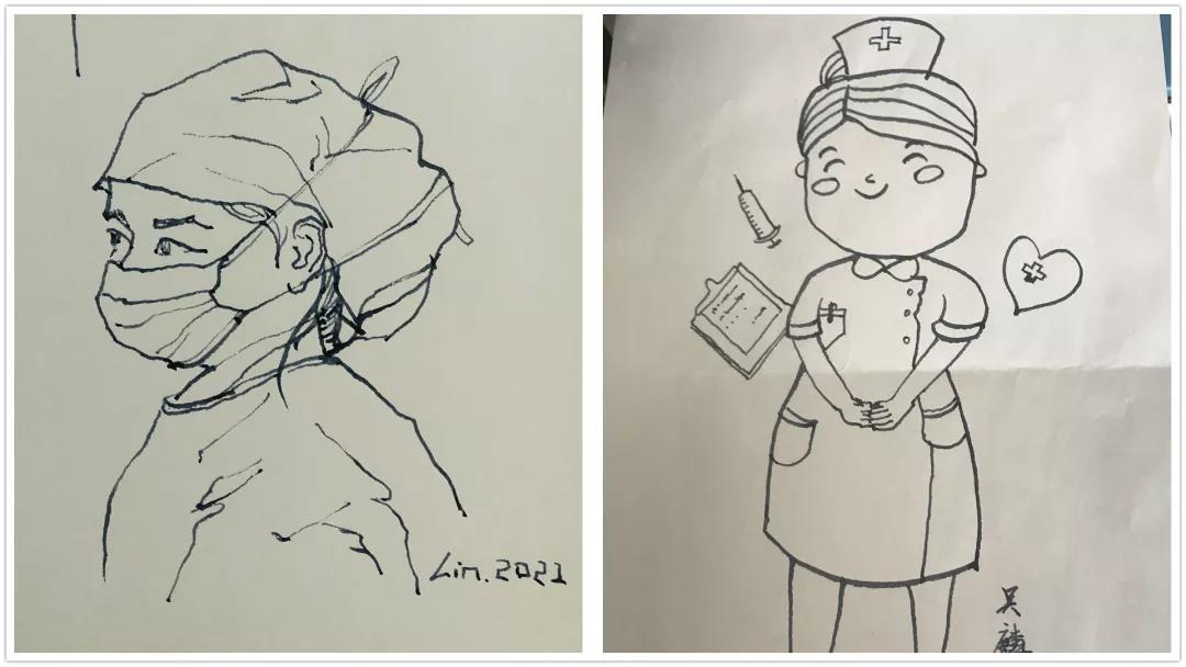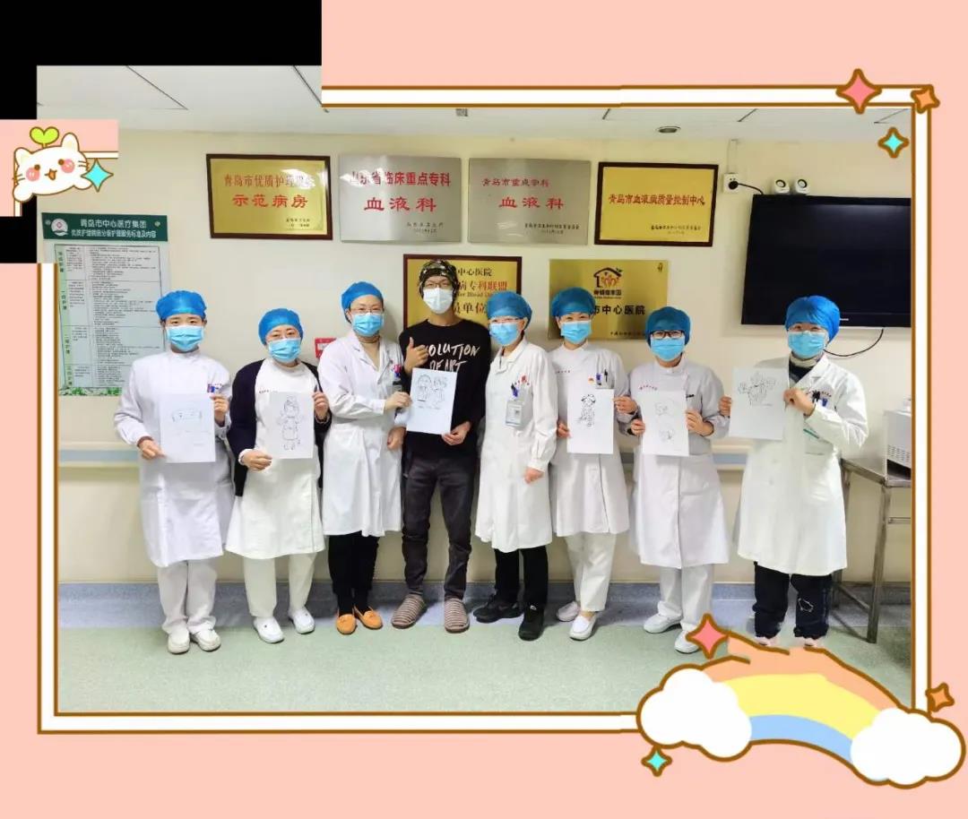 生命垂危时,医护人员全力救治他;生活不能自理时,医护人员悉心照料他;心情低落时,医护人员不停开导他.......吴麟的家人没有放弃,青岛市中心医院血液内科的医护人员也没有放弃。在大家的共同努力下,吴麟闯过了感染、心衰、出血等难关后,创造了第二次移植时机。2020年3月,终于在中华骨髓库找到配型9/10相合的供者。2020年5月6号凌晨4点06分,来自海南的供者干细胞顺利输注到了吴麟体内。这场跨越半个中国的“生命速递”事件还出现在了岛城初中生的试卷里。这次治疗后,吴麟恢复很快。为了充实自己,他在移植仓治疗期间报了画画班,想用自己的画笔画出他心目中白衣女神的面孔,而这女神就是这些像家人一样照顾他的医护人员。2020年7月,吴麟在经历了近一年的治疗后终于出仓回家了。自此,“移植一哥”的名号被正式叫响。