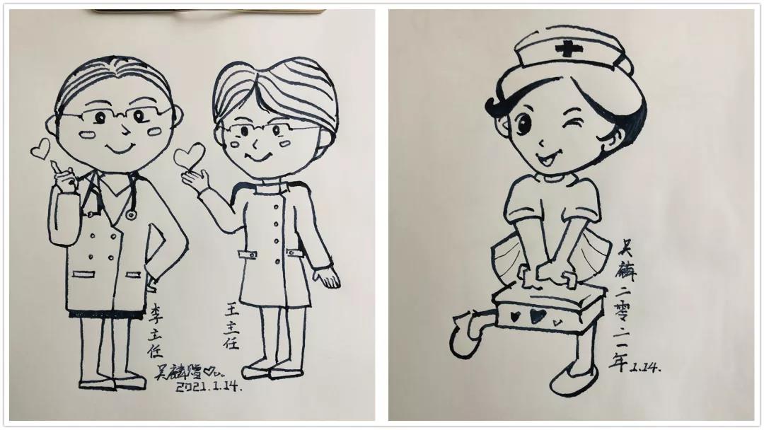 2021年3月8日,吴麟回到青岛市中心医院复查,并将提前画好的漫画像送给了血液内科的医护人员。漫画像中的王玲主任、李颖副主任、移植仓的护士们......不管是模样还是神态,都像极了本人,十个月的陪伴才有了这般栩栩如生。这是属于血液内科医护人员与“移植一哥”之间的默契,是医患之间的情谊,也是血液内科白衣女神们收到的最好妇女节礼物!
