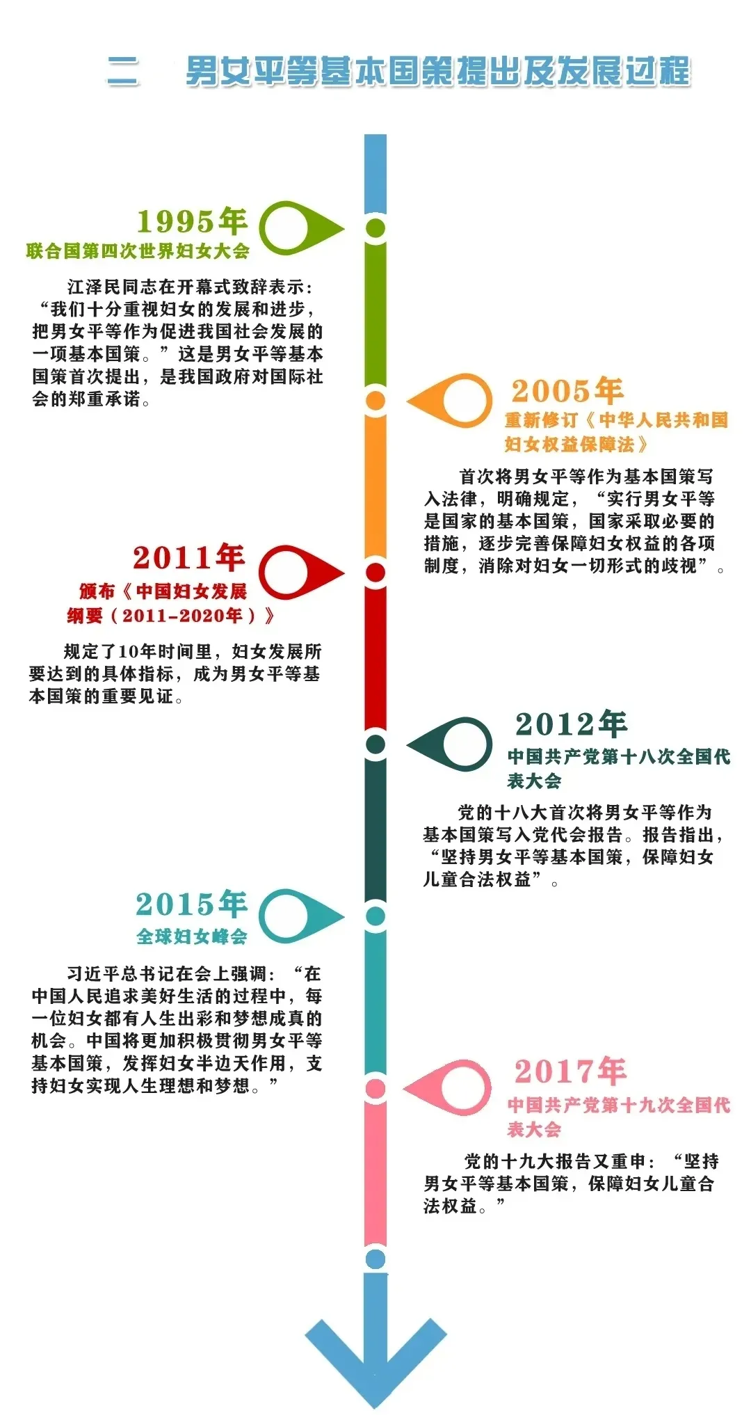 从具体的政策法规看,决策的制定、执行和评估的全过程,要始终体现男女平等的原则。