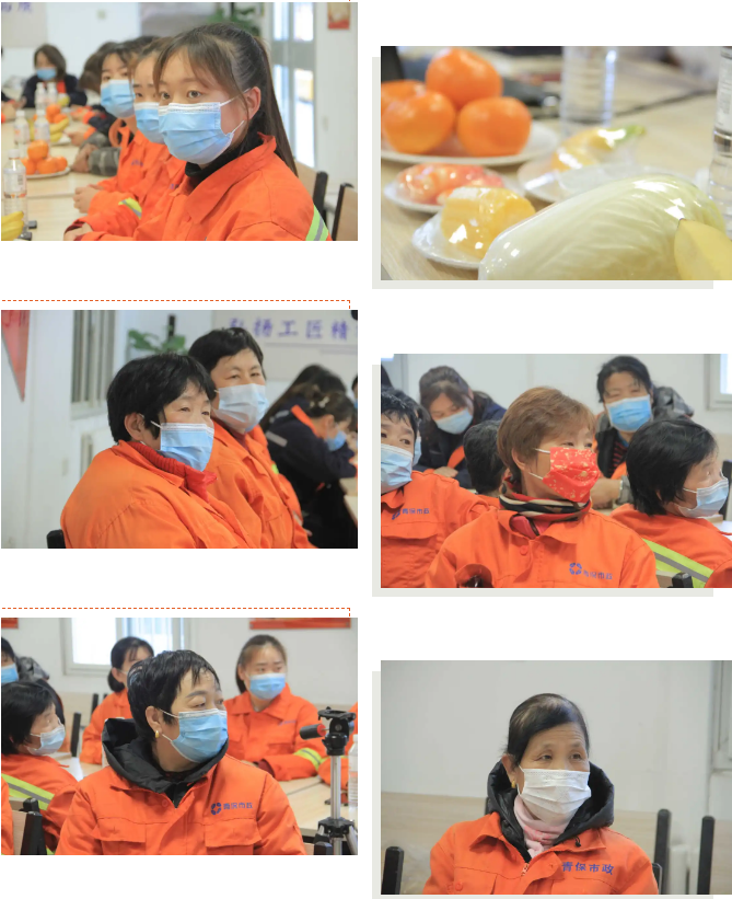 最后王主任强调,环卫工人应保持精神愉快,劳逸结合,少吃盐,不要抽烟、喝酒,平日里应多吃鱼、禽、蛋、瘦肉、素食、黑木耳、胡萝卜、菠菜、卷心菜、西蓝花、香蕉、葡萄、苹果、雪梨、坚果等,喝水同样也很重要。