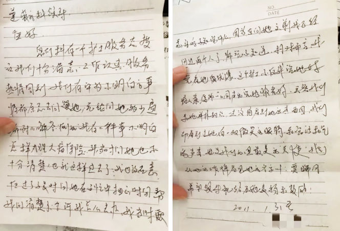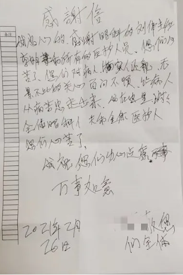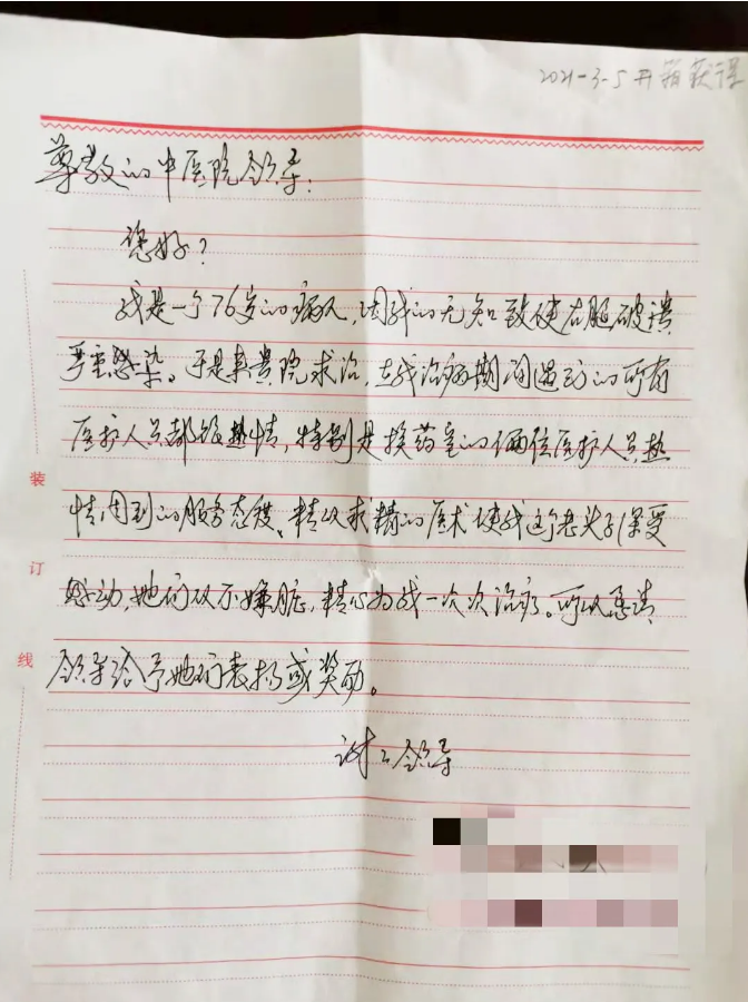 76岁的老人给换药室的两名医护人员送来感谢信,感动于热情的服务态度,对精益求精的医术赞叹不已。
