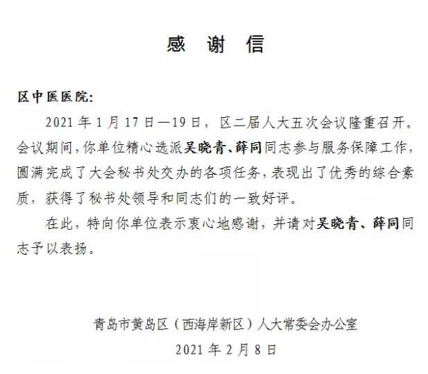 在青岛西海岸新区二届人大五次会议召开期间,内分泌科吴晓青和心血管科薛同圆满完成医疗保障任务,尤其是提供的中医药服务获得了秘书处领导和同志们的一致好评。