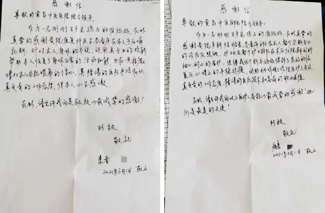 近日,王女士给产科和康复科分别送来感谢信,感谢产科陈维爱、李爱萍、郑玲、相春华以及护理团队对整个孕期专业的诊疗和照顾。康复科李春序通过专业治疗为王女士恢复了身体机能,增强了母乳喂养的信心。