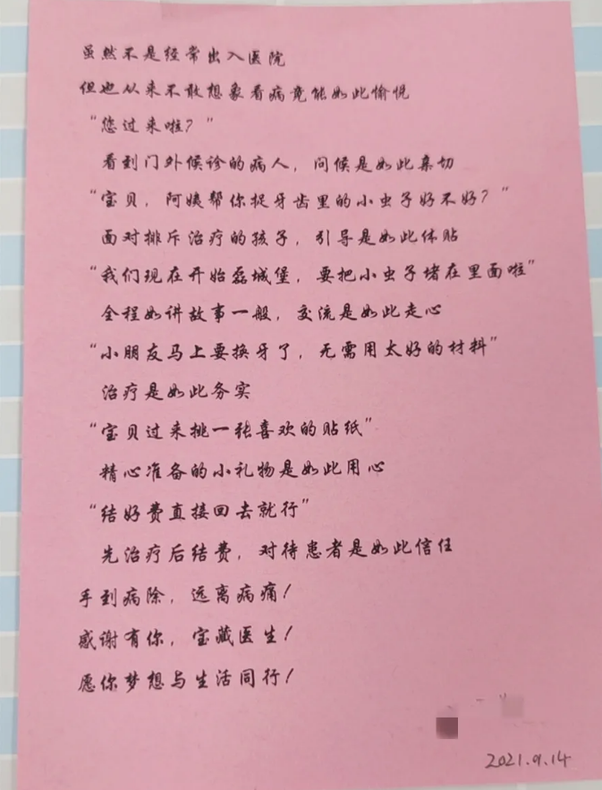 近日,口腔科小患者的家长对医生的服务感触颇深!医生用小朋友易于接受的方式,缓解了小患者的心理压力,让就诊过程变成了一次奇妙的冒险。