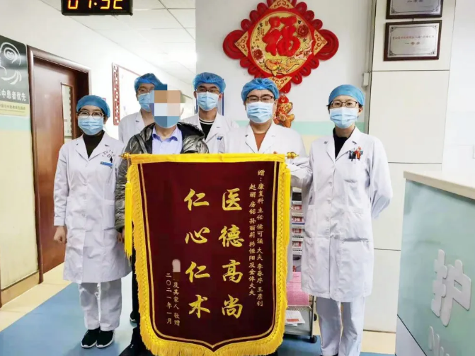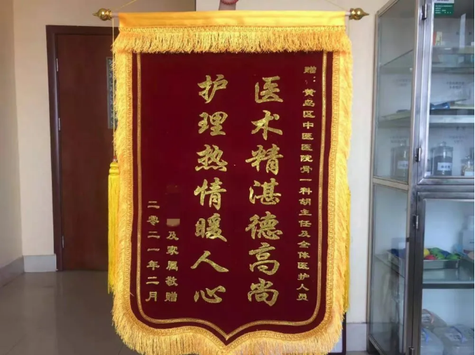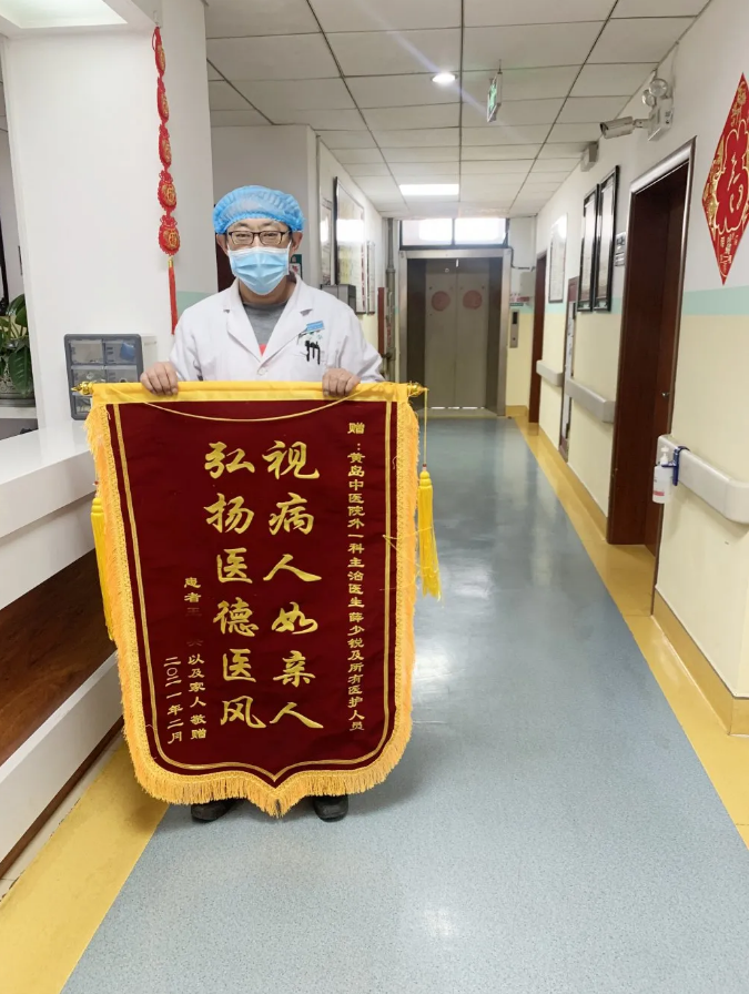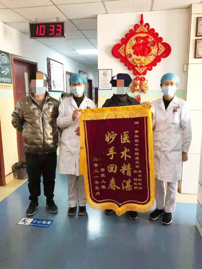 2021年1月,患者手捧一面“医德高尚仁心仁术”的锦旗来到青岛西海岸新区中医医院,表达对康复科侯可强主任、李春序、王彦钊、赵丽、房铭、孙丽莉、韩恒阳及全体医师的感激之情,赞扬他们高尚的医德和精湛的医术。