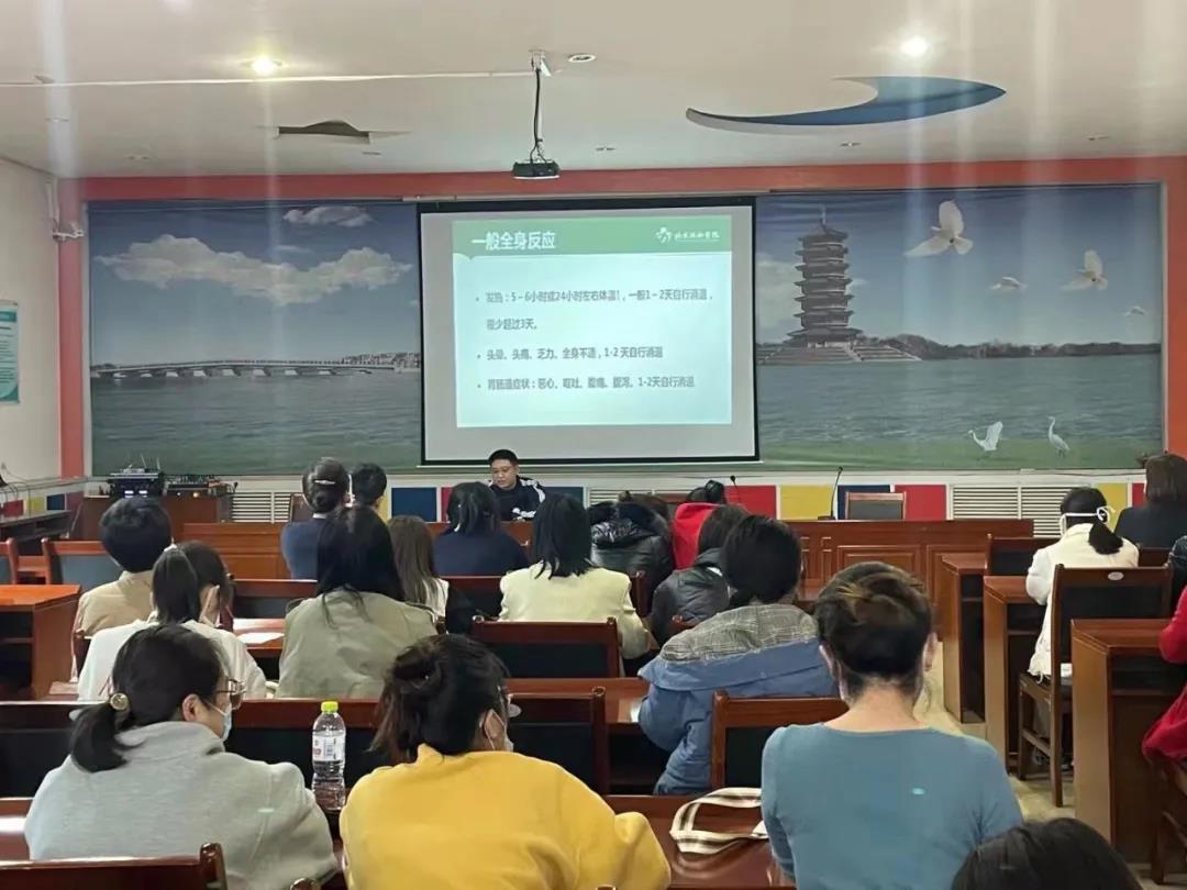同时我院还在五楼大会议室组织全体医护人员开展了过敏性休克及预防接种异常反应救治培训,进一步提升医护人员的接种能力和救治水平。