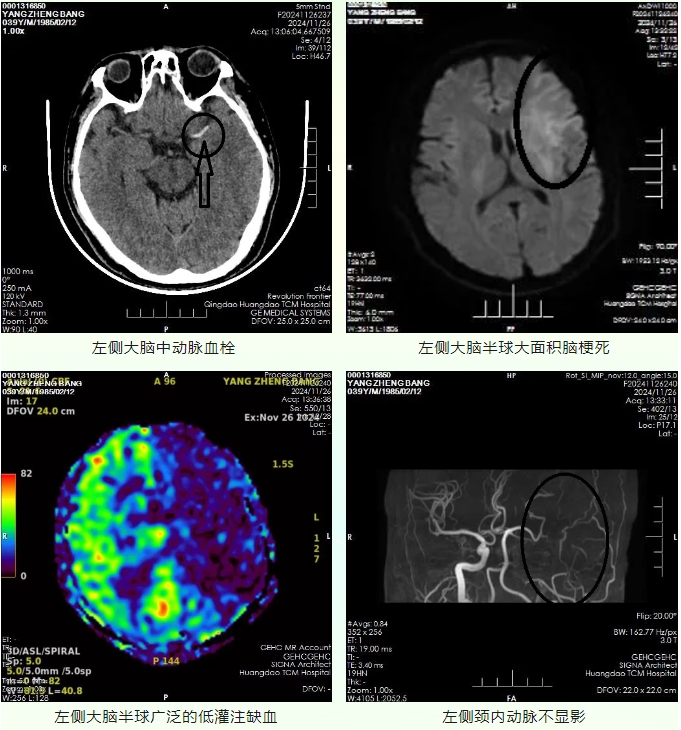 来青务工的赵先生现年39岁,入院前1.5小时被邻居发现躺在出租屋内,不能言语,右侧肢体无力,拨打120送至青岛西海岸新区中医医院急诊科。急诊脑CT示左侧大脑中动脉高密度影,初步诊断为大面积脑梗死,患者起病时间不详,急查磁共振检查,DWI示左侧大脑半球大面积脑梗死,左侧大脑半球存在广泛的低灌注缺血区,可予静脉溶栓治疗。