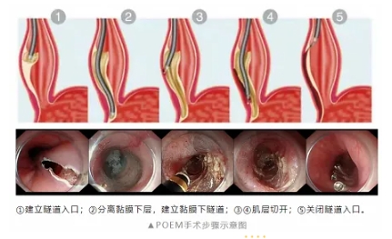 经口内镜食管下括约肌切开术是通过内镜下建立食管粘膜下隧道,将食管下端与贲门之间的固有肌层切开的微创治疗技术,手术通过在狭窄上方食管约10cm的位置切开粘膜层,剥离黏膜下层建立黏膜下隧道至贲门下方2cm-3cm,然后对范围内的固有肌层切开切开,狭窄严重的部位要进行全层切开,从而达到解除梗阻的目的。