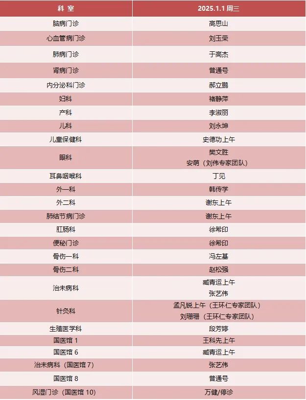 2025年元旦假期门诊排班