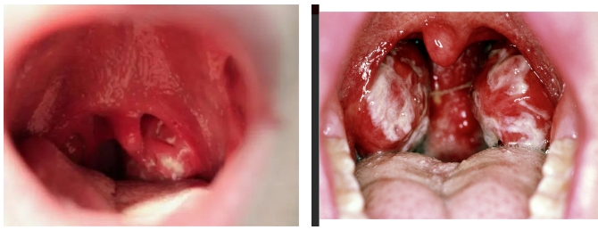 表现为咽痛,咽部、扁桃体,腭垂充血肿胀,扁桃体上有溃疡,被覆较厚的分泌物,严重的咽部水肿,引起吞咽困难及气道阻塞。