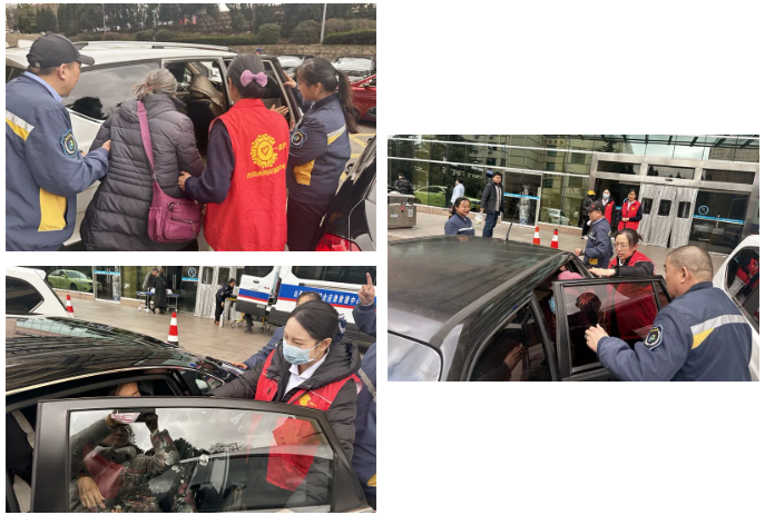 在医院团委的组织下,“一缕阳光”志愿者和保安的引导下,血液透析室的护士们密切配合,将刚刚做完透析治疗的患者免费送回了家。