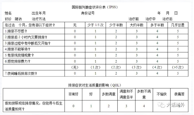 IPSS患者分类如下:轻度症状 0-7分 中度症状 8-19分 重度症状 20-35分。上述两个评分表能够使医生很好的了解患者目前的状态、疾病的程度。对于重度患者及药物治疗无效的中度患者,一般需要手术治疗。