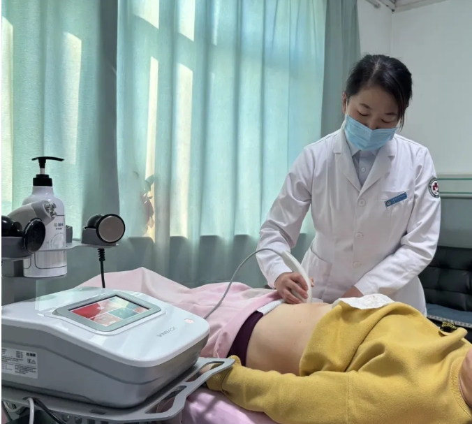 32岁的王女士剖宫产后6周,超声显示子宫复旧不良(宫底高度未恢复,恶露淋漓不尽)。产科医护人员将射频治疗仪电阻及电容探头分别置于下腹部,设置能量40-60%,治疗各10分钟