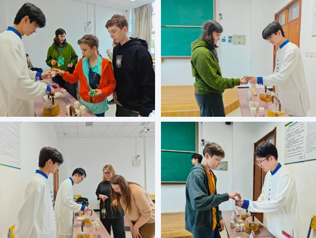 医护人员为国际学生讲解中药材知识,现场揭秘配方奥秘,每一杯茶饮都遵循“君臣佐使”配伍原则达到养生目的。