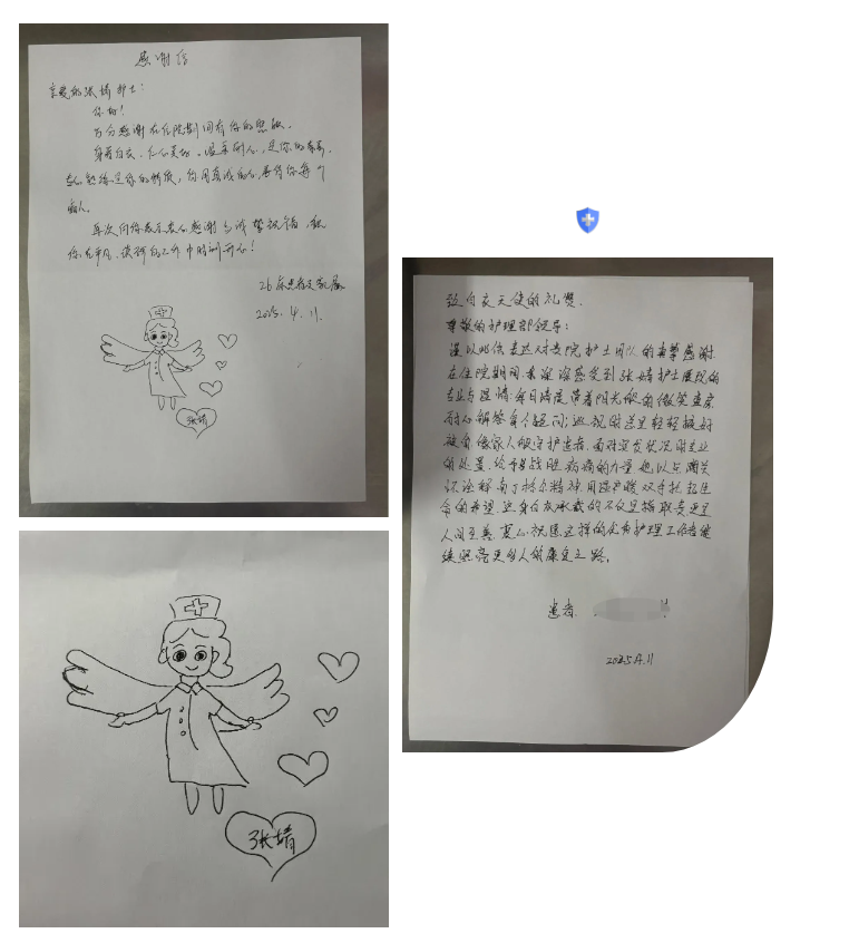 当张婧收到荆大姐和王阿姨及其家属送来的表扬信和简笔画时,心中充满了感动和自豪。她深知,那不仅仅是一封信、一幅画,更是对团队工作的最高赞誉和深深认可。她说:“这只是我本职工作的一部分,但没想到我的付出得到了患者及家属的如此肯定,这让我更加坚定了自己的职业选择。”