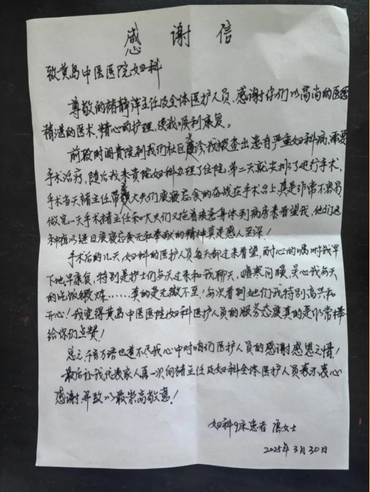 出院后,妇科团队通过电话、线上平台持续跟踪患者康复进展,并指导其进行科学的盆底肌锻炼。如今术后唐女士已完全恢复正常生活,她感慨:“这次治疗不仅让我摆脱了多年的痛苦,更让我看到了一群医德高尚、技术精湛的白衣天使是如何用责任与爱心守护患者的!”
