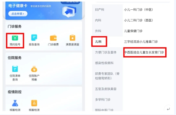 2.选择本部 南院区预约→“预约挂号”→“儿科”→“中西医结合儿童生长发育门诊”。