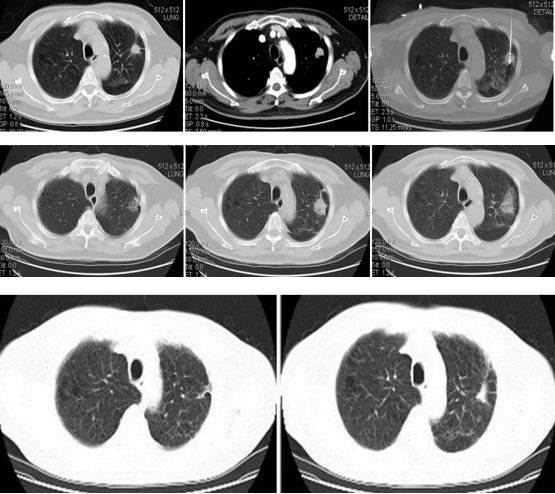 左肺上叶病灶消融术后,病灶缩小呈瘢痕改变