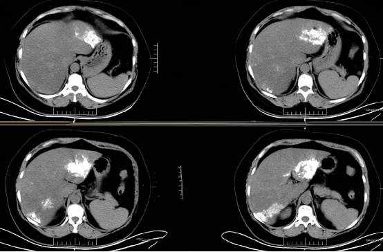 术后复查CT,可见瘤体内碘油沉积良好