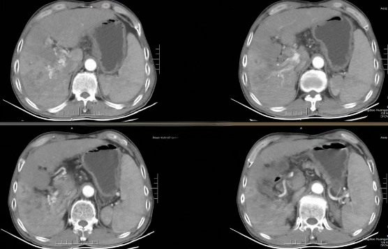 术前增强CT示肝右叶肿块伴门脉瘤栓形成