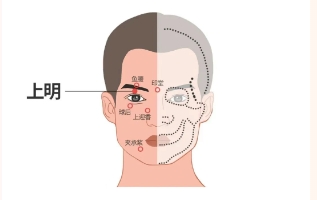 (1)上明穴:位于眉弓中点,眶上缘下。