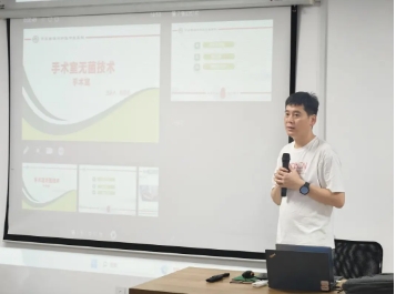 手术室护士长赵品会以《手术室无菌技术规范》开展实操教学,详细介绍了无菌原则、无菌物品管理、无菌操作规范等内容。在实操环节,赵品会护士长亲自示范了穿脱无菌手术衣、戴无菌手套等操作,并对实习生的每一个动作进行严格指导。