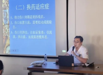 外一科副主任医师邓康为实习生开展了《外科换药操作技术》培训。以模拟伤口为例,详细演示了换药前准备、伤口评估、换药操作、敷料包扎等流程。